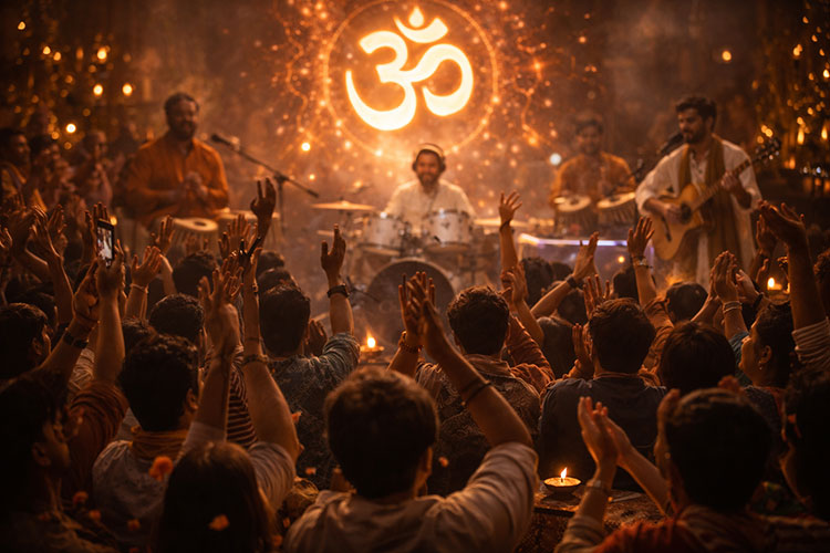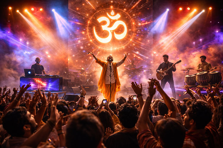 LED walls. Laser beams. Massive speakers. DJs remixing sacred chants. A charismatic spiritual leader commanding the stage like a headliner. Phones raised high, livestream counters ticking.